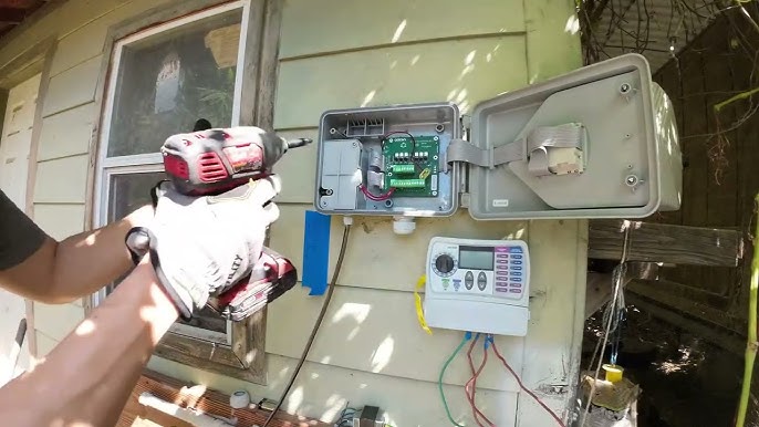 Clean wall mount, labeled wiring, surge protection, and rain/soil sensor integration.